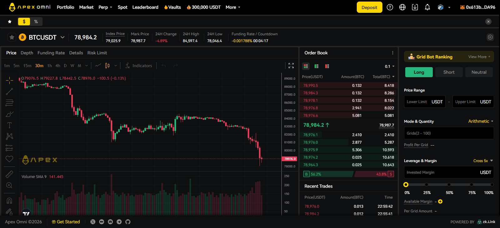 After your account is created, you can start using ApeX Omni features, including perpetual trading, spot markets, prediction markets, real-world assets, and grid bot tools.