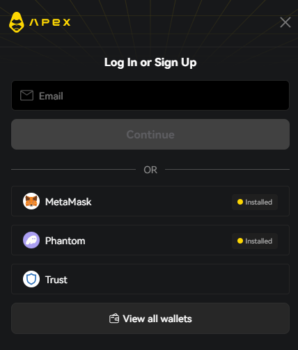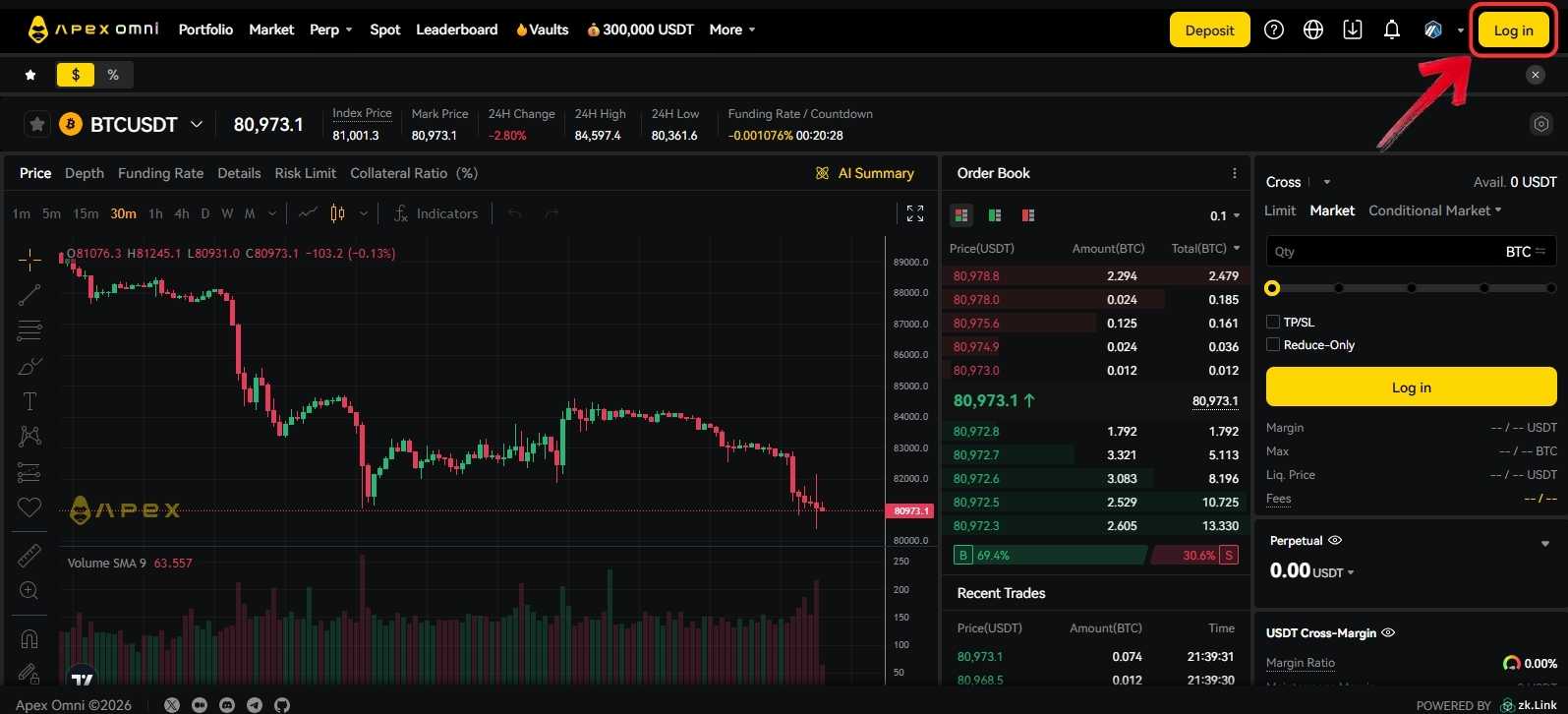 Step 2: On the ApeX Omni screen, click “Login” in the top-right corner. You can connect using an email address or a supported Web3 wallet.