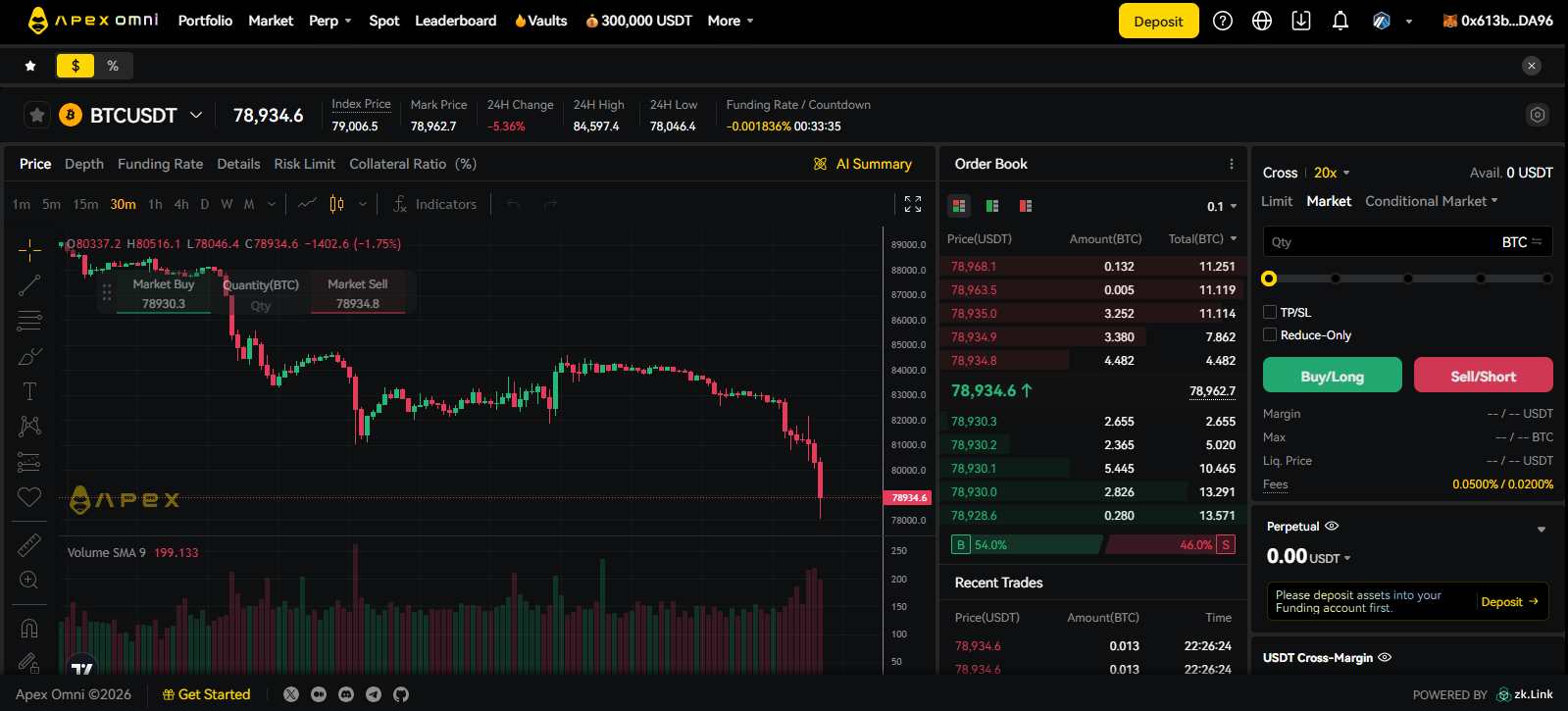 For spot trading, ApeX Omni supports over 20 cryptocurrencies. Spot trades are executed with a 0.00% maker fee and a 0.05% taker fee, which keeps costs predictable for both passive and active traders.