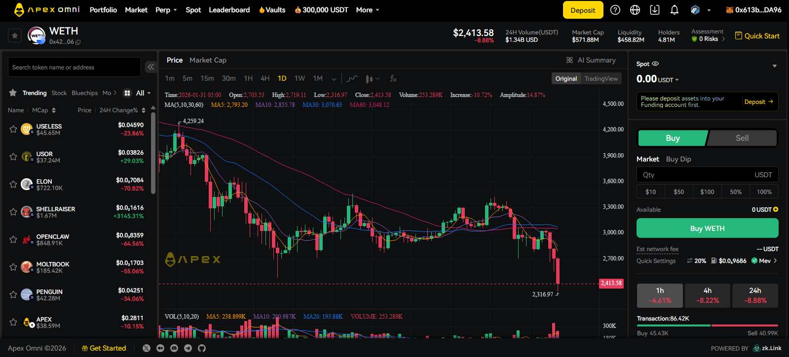 - ApeX Omni combines perps, spot swaps, RWAs, and prediction markets in one interface