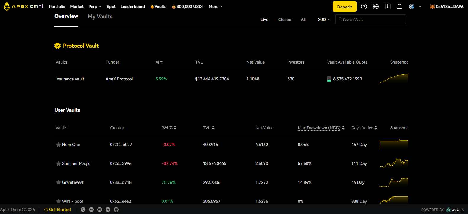 Alongside trader vaults, ApeX Omni also offers protocol vaults. These allow users to deposit USDT to provide liquidity to the platform and earn yield, with returns reaching up to 7.65%, depending on market conditions.