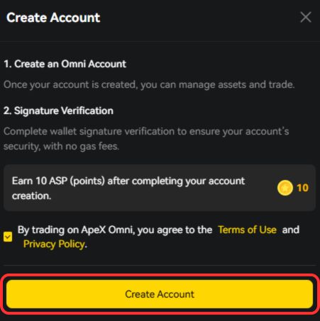 To create an account on ApeX Omni, users need an EVM-compatible Web3 wallet such as MetaMask or Rabby Wallet. The setup does not involve account registration or KYC. You simply connect your wallet and approve access to ApeX Omni to begin.