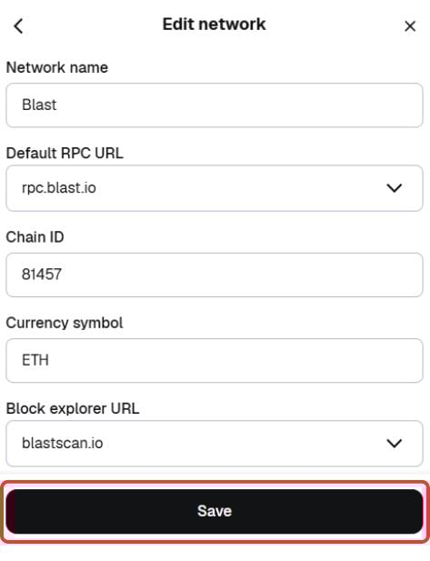 Step 5: Add Blast’s RPC details to the form fields, verify the inputs, and click “Save” to confirm.