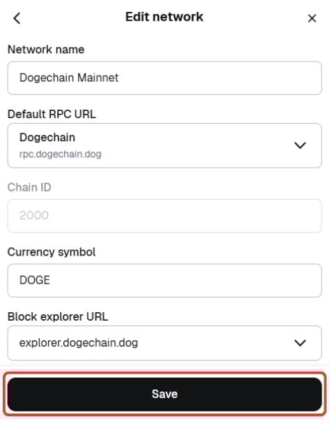 Step 5: Enter all relevant RPC information for Dogechain, verify your entries, and click “Save”.
