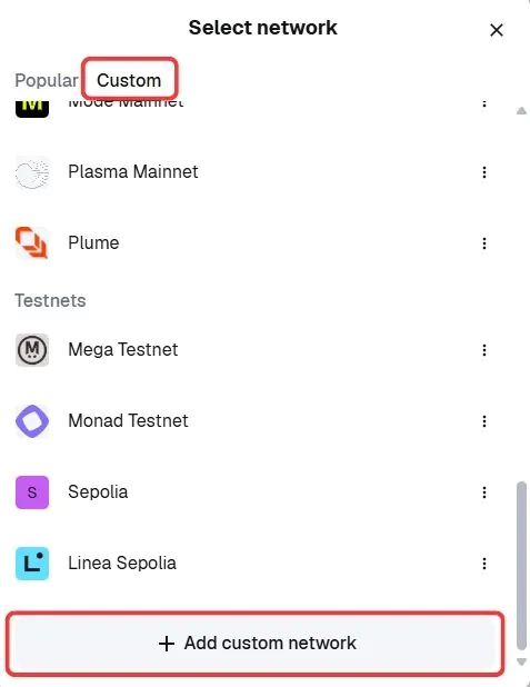Step 4: In the Custom section, go to “Add custom network” to manually enter Dogechain’s settings.