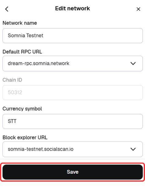 Step 5: Enter the required fields with the Somnia Testnet RPC details. Double-check the information for accuracy, then click “Save” to complete the setup.