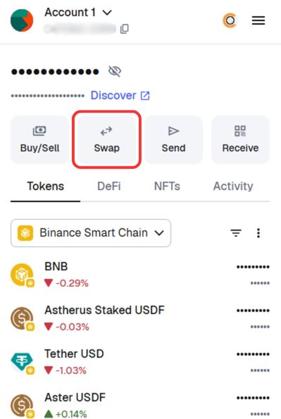 So, now that we have BNB ready, let’s quickly swap a portion of it for USDT so we have both, BNB for gas and USDT for trading on Aster DEX.