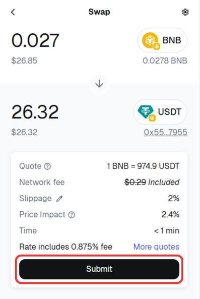 Step 4: Review the transaction details carefully, then click “Submit” to approve the swap.