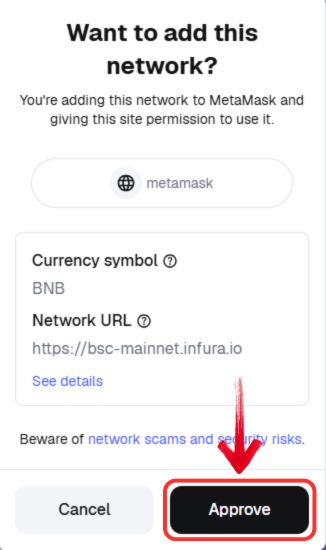 Step 4: Finally, click “Approve” to add BNB Chain to your MetaMask wallet. MetaMask will automatically switch to the new network once it’s added.
