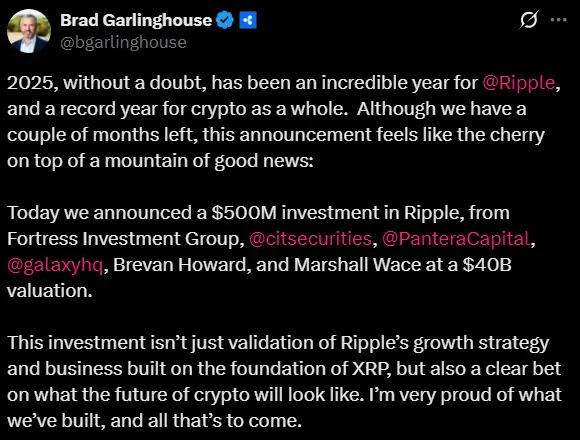 Ripple CEO Brad Garlinghouse commented on X that the funding reflects Ripple’s continued evolution. “This investment isn’t just validation of Ripple’s growth strategy and business built on the foundation of XRP, but also a clear bet on what the future of crypto will look like. I’m very proud of what we’ve built, and all that’s to come”, he said.
